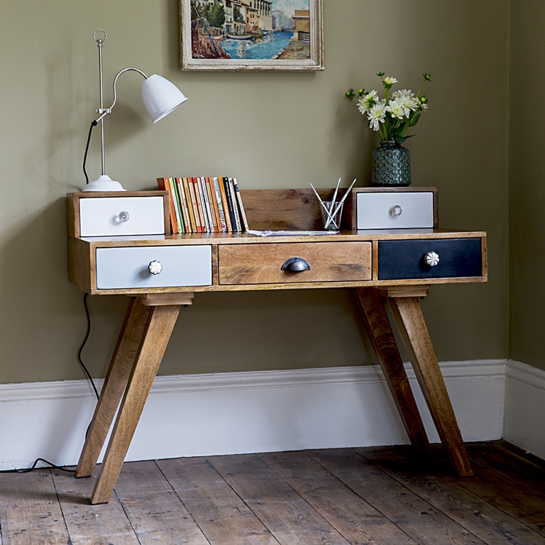 The desk is a brilliant mix of retro and modern, with it’s quirky look of different coloured draws and handles, it exudes a flavour of uniqueness and style. ย It would fit perfectly under my stairs, in the recess by the fire or the nook in the spare room.