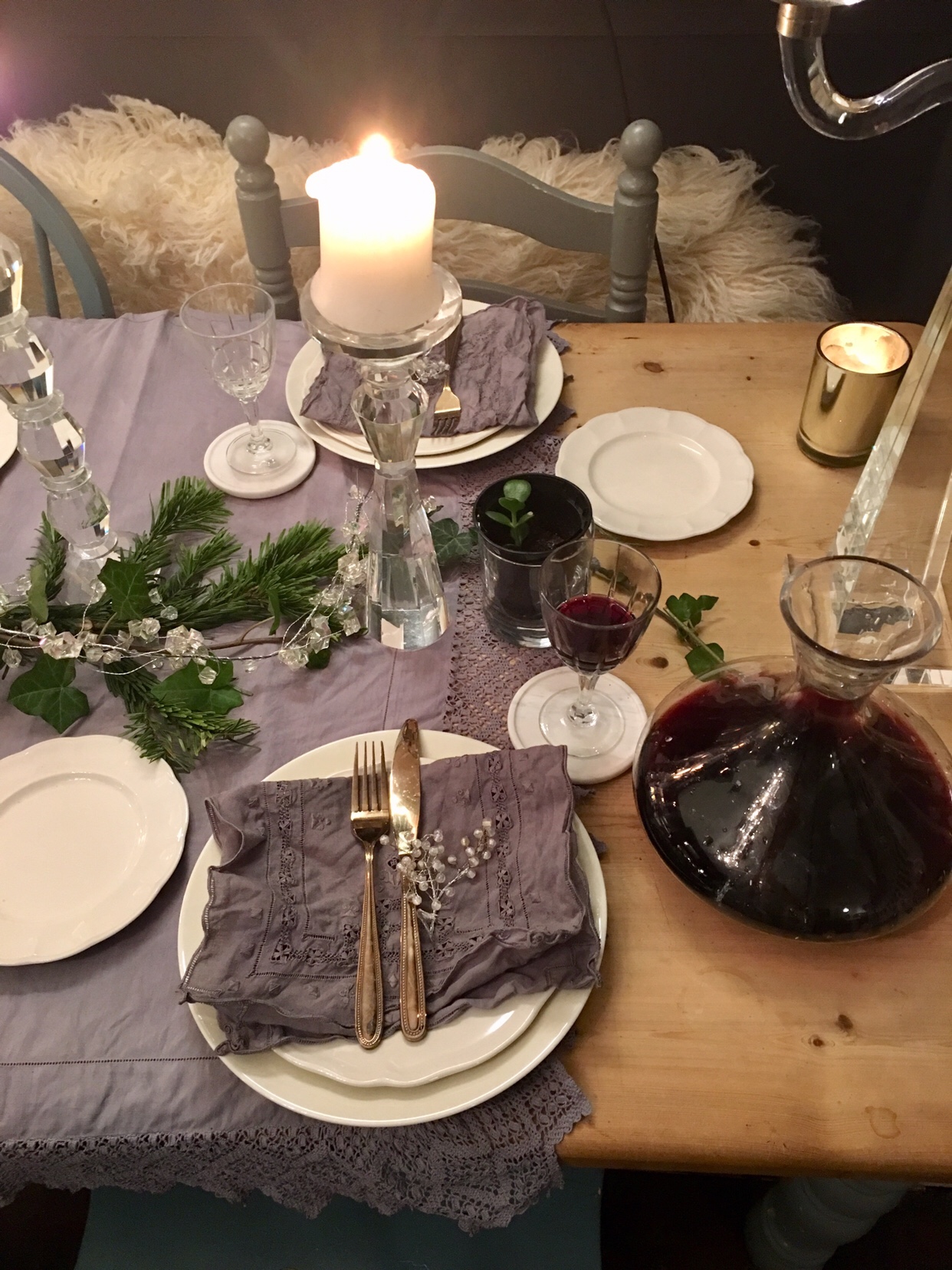 Add a little sparkle, crystal, baubles, more lights.ย I’ve finished with vintage crystal glasses and gold cutlery.